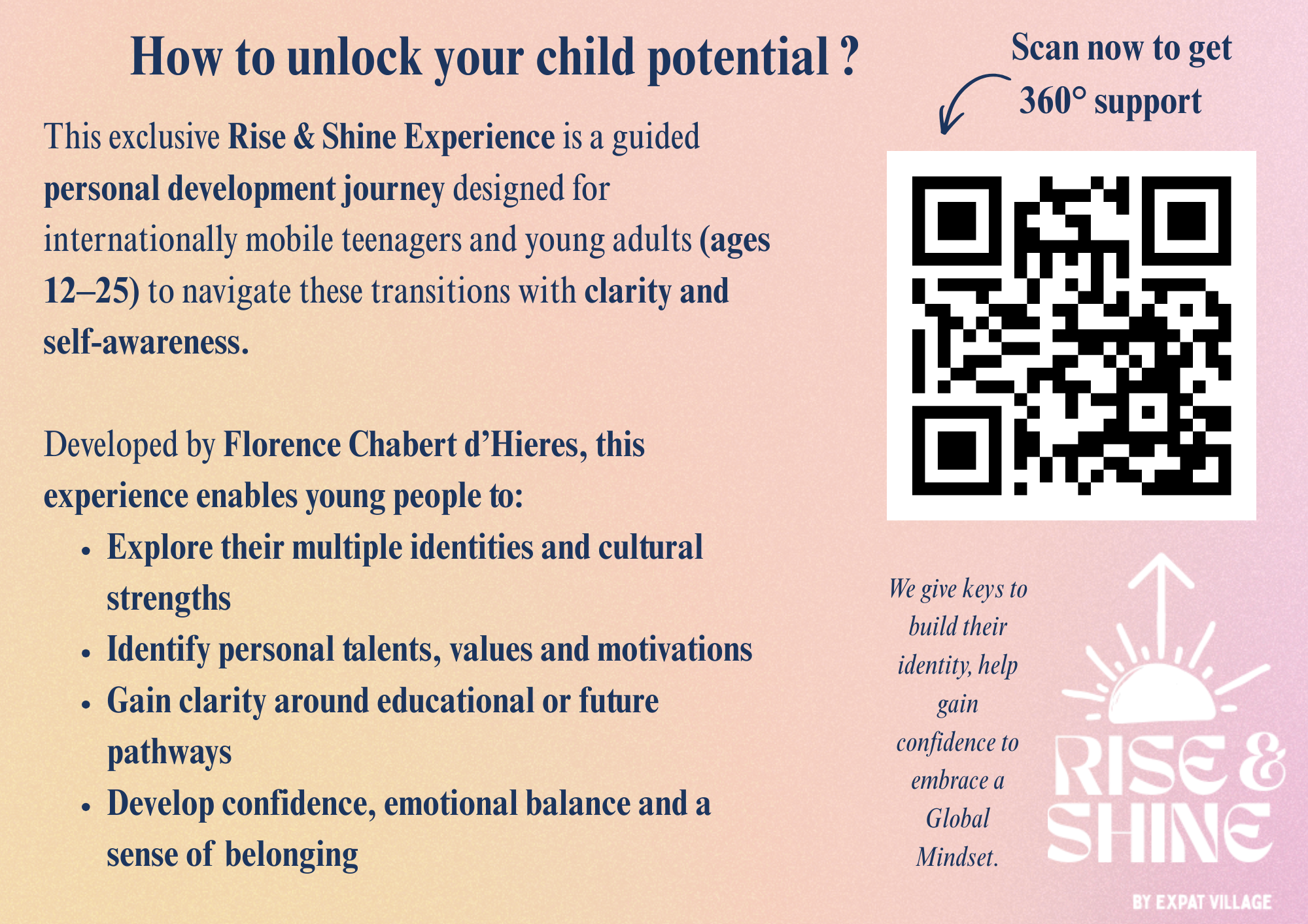 Les visiteurs pourront également découvrir Rise & Shine, une expérience immersive proposée par Expat Village, conçue pour aider les jeunes à explorer leur identité dans un contexte international, réfléchir à leur orientation et renforcer leur bien‑être. Dans un cadre bienveillant et inspirant, Rise & Shine invite les jeunes et leurs familles à prendre un moment pour réfléchir à leur parcours et à leur avenir.